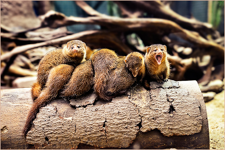 Tiere   Zoo   Gefangenschaft   Meute   Fell   Baumstamm   Holz   Gruppe     Details anzeigen